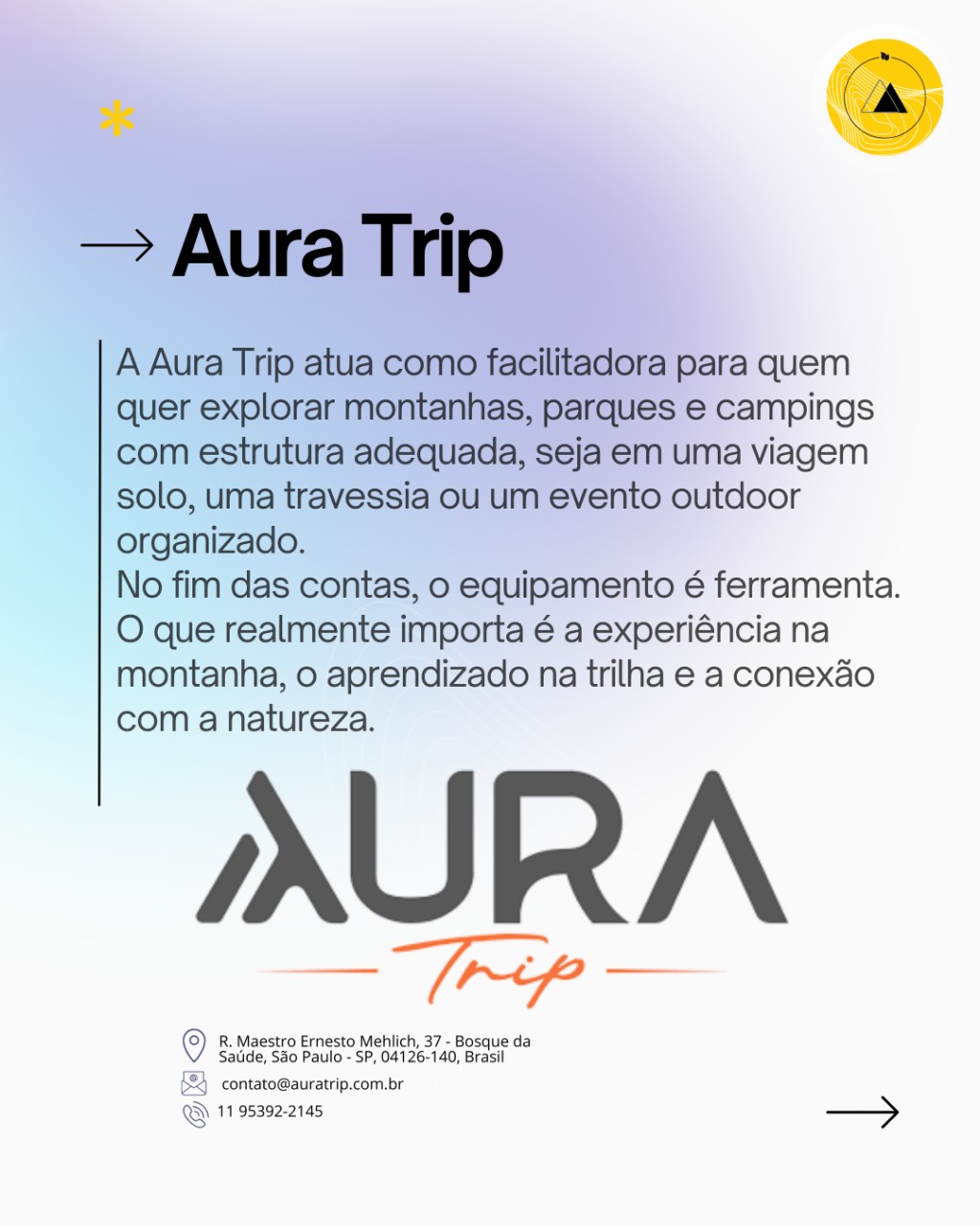 A Aura Trip atua como facilitadora para quem quer explorar montanhas, parques e campings com estrutura adequada, seja em uma viagem solo, uma travessia ou um evento outdoor organizado.